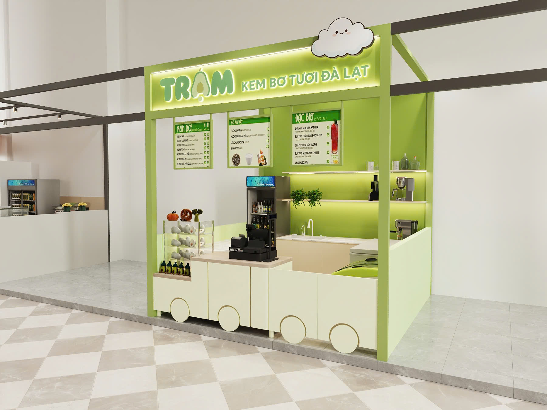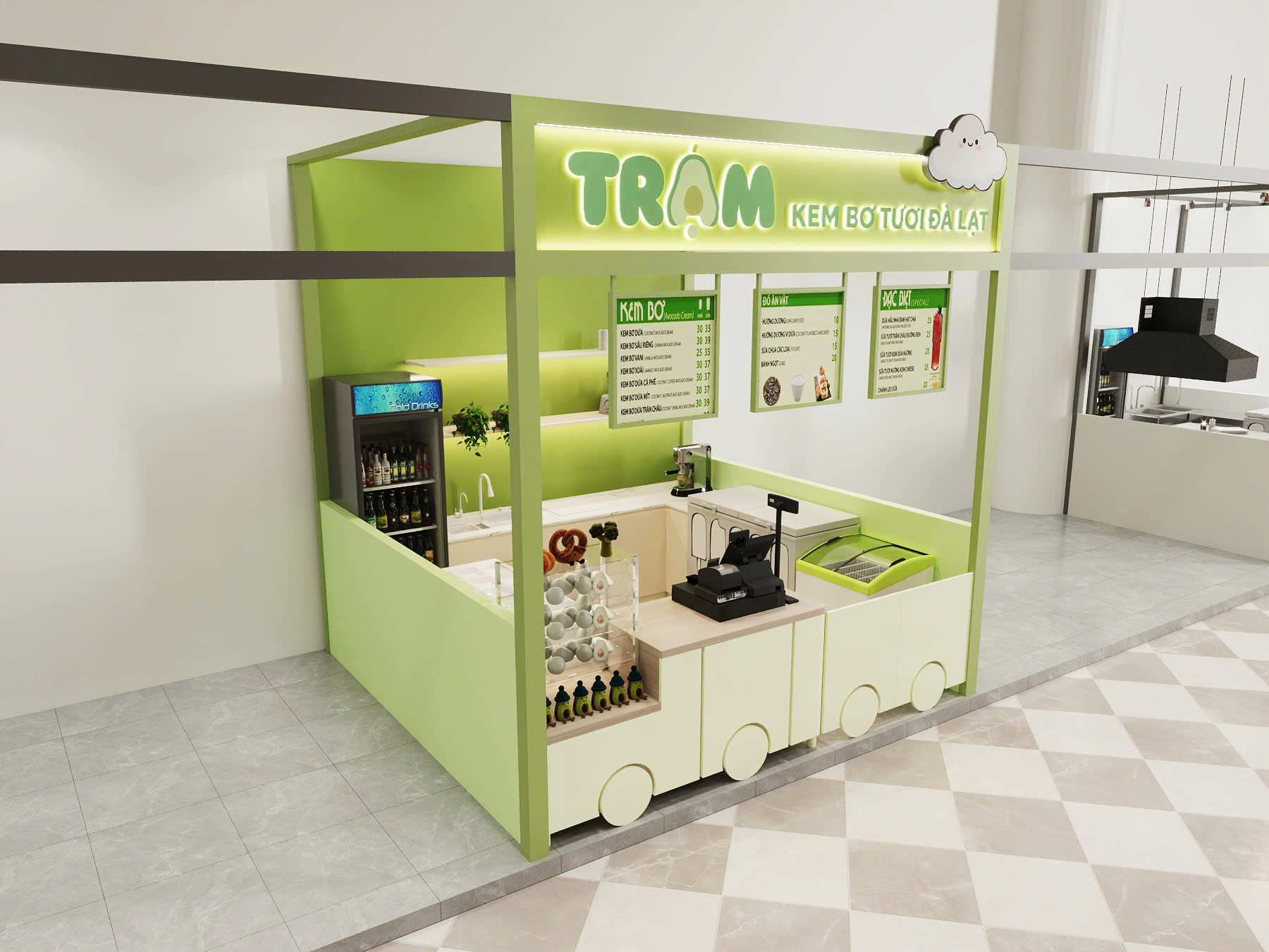 Quầy chế biến mở: Thiết kế quầy kem mở giúp khách hàng dễ dàng quan sát quá trình chế biến kem bơ tươi, tạo sự tin tưởng và tăng tính trải nghiệm.